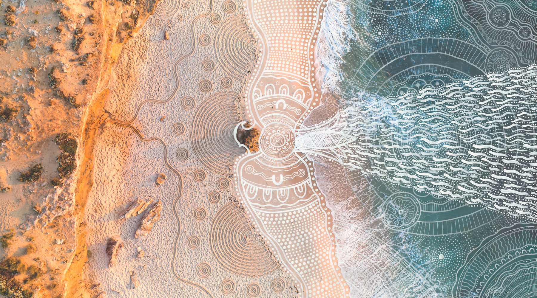 The story you see painted is already in the land it is a part of the spirit and energy of our ancestors and creator spirits, I separate myself and my mind and open it to receive this energy. I remember my Uncle telling me that our energy and the energy of our ancestors and creator spirits are still here and all around us, they are imparted into the trees, rocks, water sand and soil and flow through the wind we breathe and if you truly look and listen you can see and hear them and feel their touch and guidance in the wind and water, as I looked into Lowey’s image there he was in all his brilliance Bunjil showing his spirit, flying across the sea and onto the land, his wings stretched out across the sand his head in the rock and tail feathers in the sea, such a special gift and I am just here to bring Bunjil’s Spirit onto the canvas, being a saltwater man the realm where Lowell creates his beautiful artworks in the sand resonates with me and I can feel the energy of the saltwater spirits.